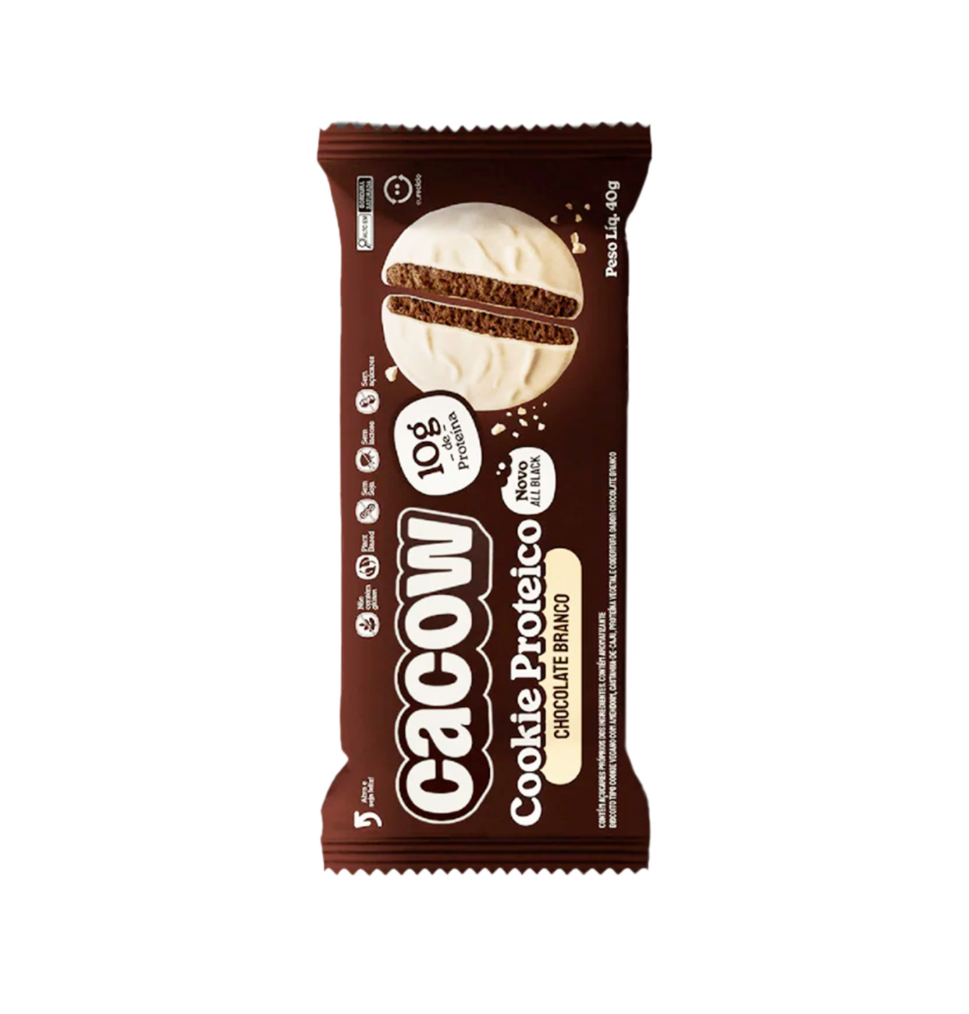 Delicioso cookie sabor chocolate, coberto com chocolate branco. Sem adição de açúcar, fonte de fibras e sabor fantástico com 10g de proteínas nas 02 unidades que vem na embalagem.
